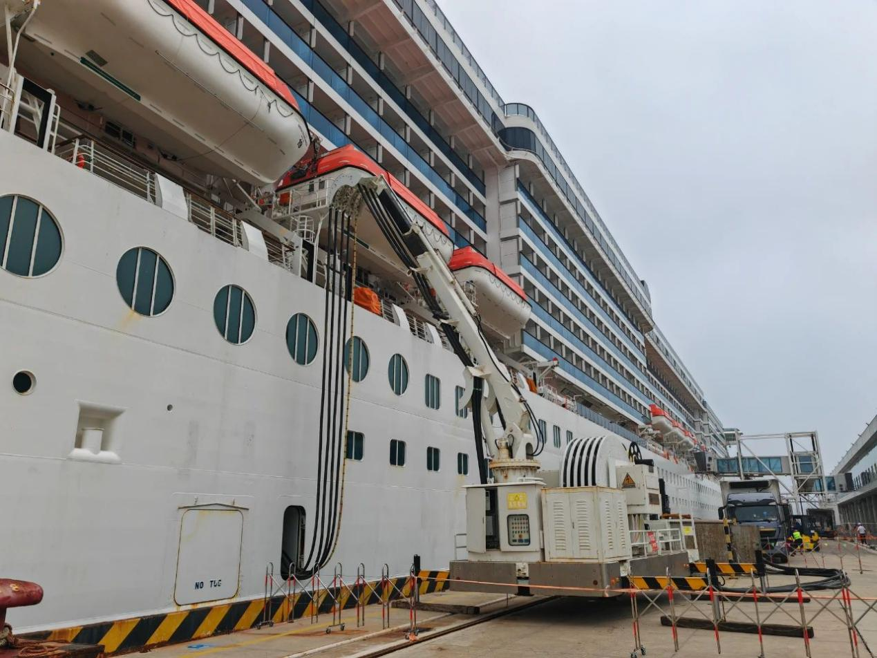 由智光電氣股份提供的16MVA高壓岸電系統,于2023年由中國船級社質量認證有限公司(CCSC)開展連船前現場檢測,完成了岸電空載運行試驗、全負荷加載運行試驗,取得了岸電系統檢測報告和中國船級社檢驗證書,滿足大型郵輪使用岸電的需求。本次岸電連船供電3小時,接電量達到14807kWh,減排二氧化碳3.95噸,實現了青島郵輪母港首次岸電連船。