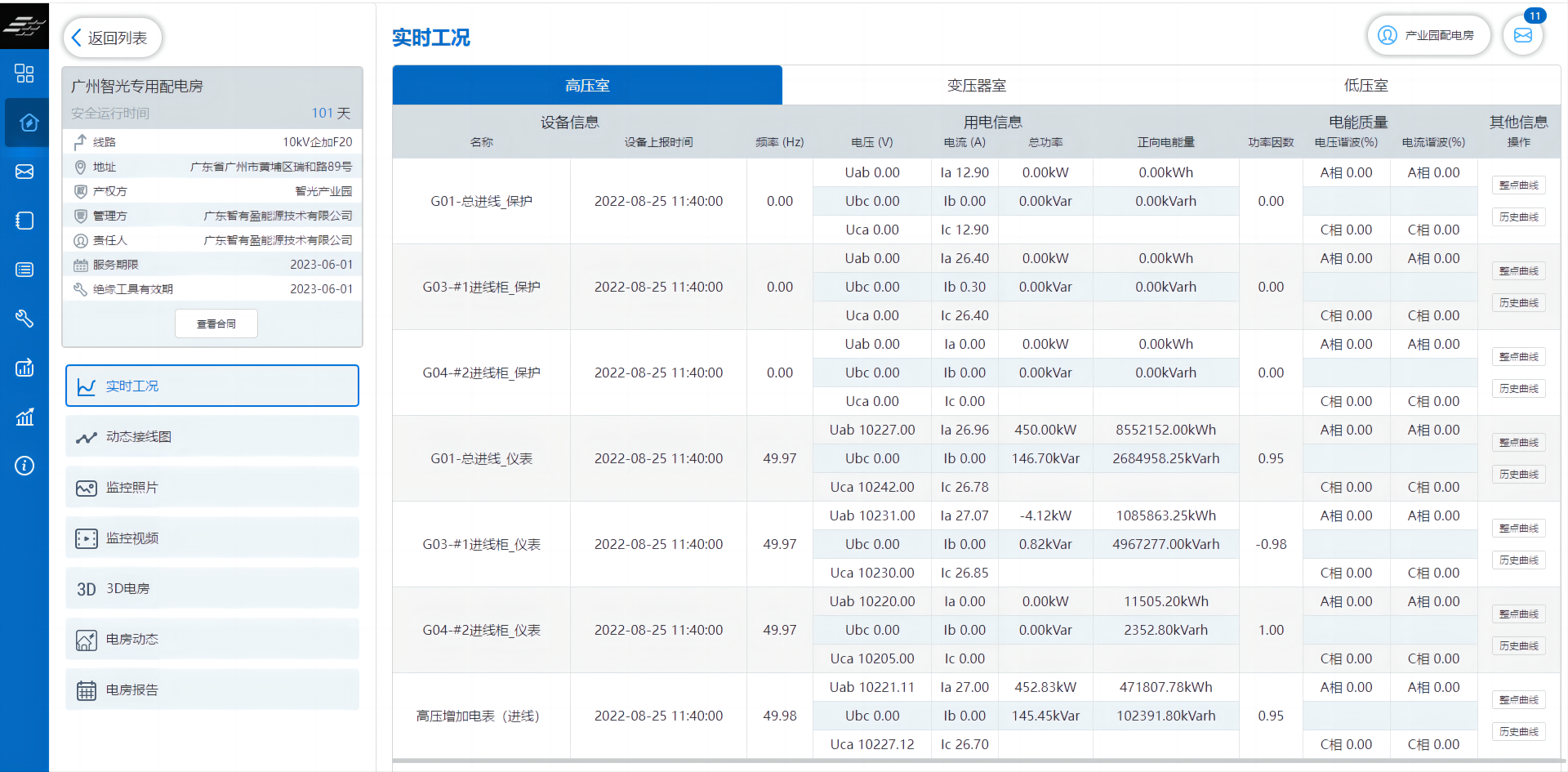 通過設備列表、動態接線圖等界面查看饋線及用電設備的實時運行狀況、歷史數據、監控照片、監控視頻等。用電數據不僅包括了常用的電壓、電流、功率、用電量等數據,還能查看到諸如有功需量、諧波含量等與經濟用電、電能質量水平相關的數據項目。