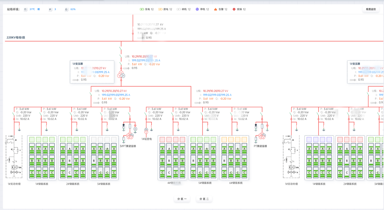 實時監(jiān)控儲能站關(guān)鍵設(shè)備包括PCS、BMS、冷卻系統(tǒng)、消防系統(tǒng)等運行情況,通過3D渲染等數(shù)字孿生技術(shù)顯示電芯電壓、溫度數(shù)據(jù),并進(jìn)行實時溫差、壓差等分析,確保電站運行安全。